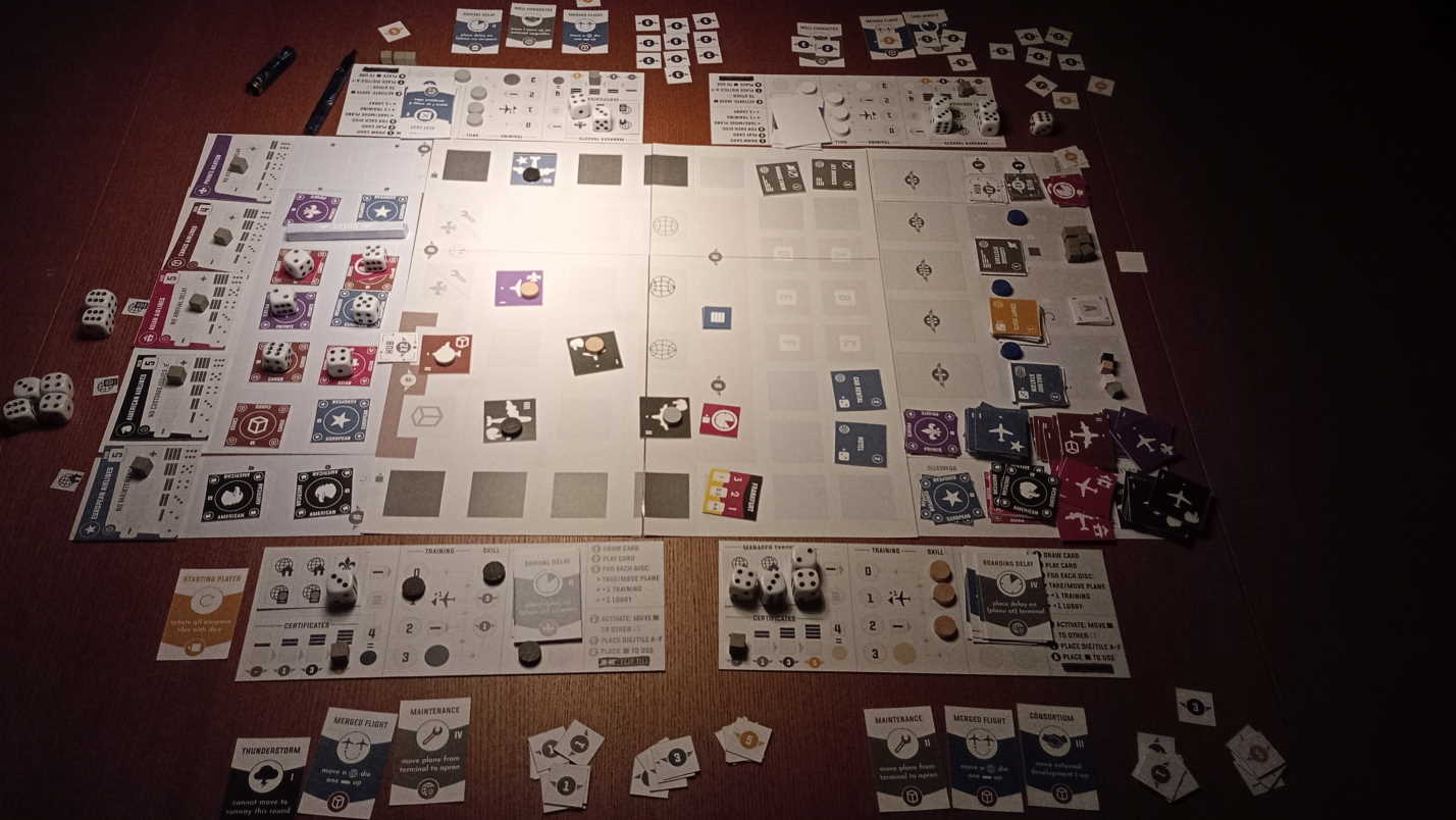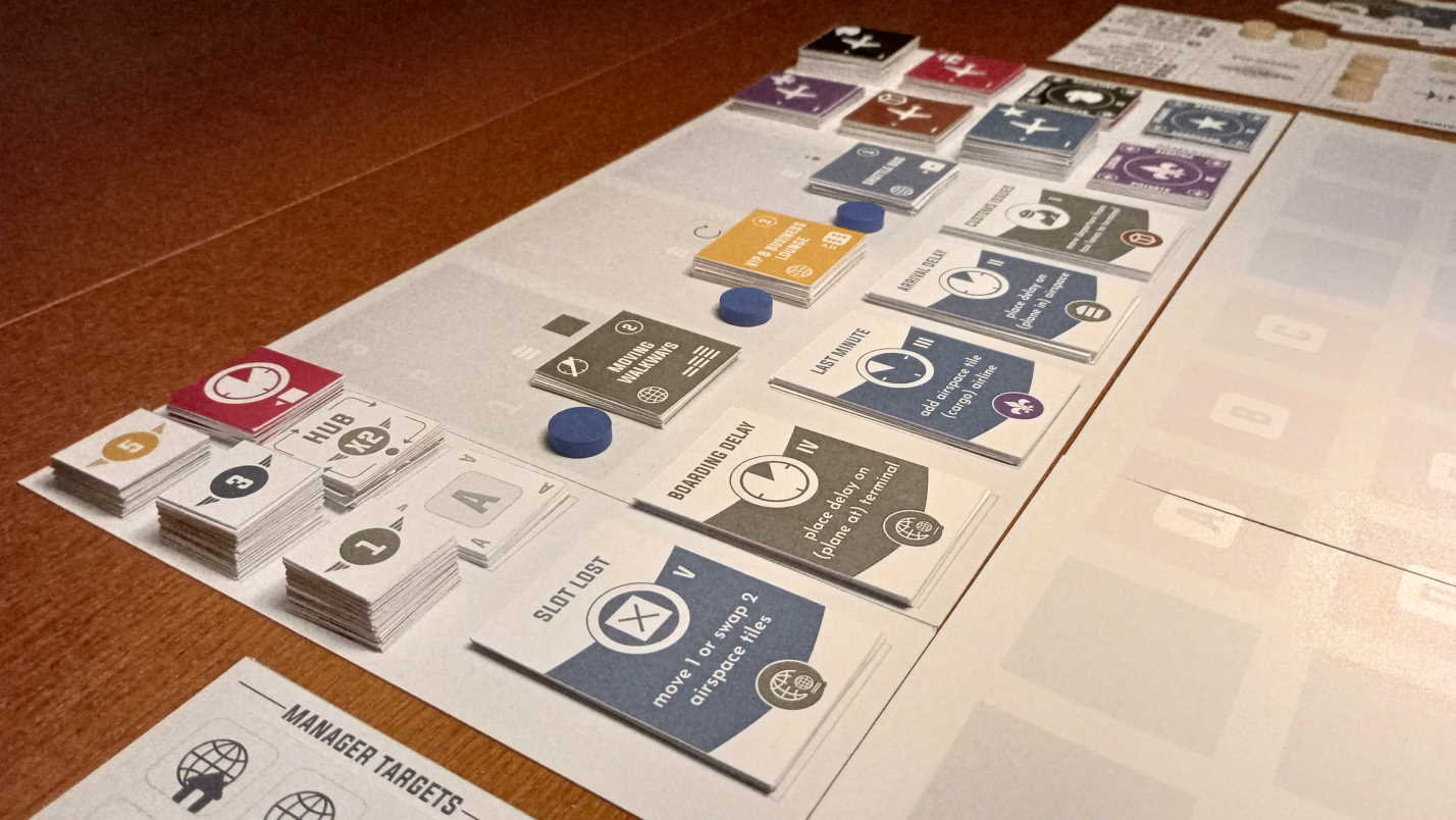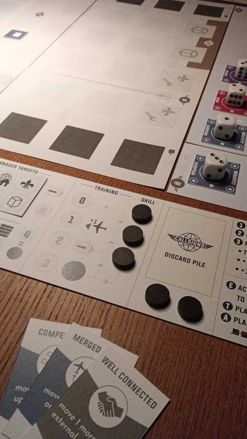 Nog niet geprint!Callsigns (hierboven) met luchtschepen. Beheer en ontwikkel een aerodrome. Verplaats je eigen luchtschepen en hinder die van anderen. Welke kaarten gebruik je als actie en welke houd je voor de telling? Zet je gunsten in om vertraging, douanecontroles en onderhoud te voorkomen.