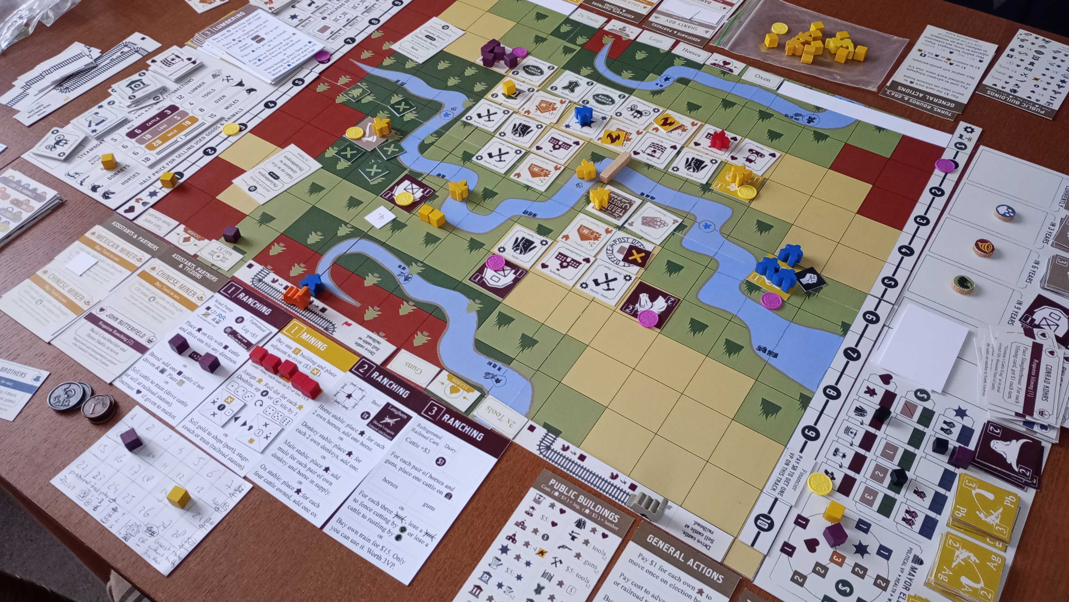 Town building board game about the Old West (1850-1900). Players compete to become a legend of the West, combining or specializing in one of the three major industries.