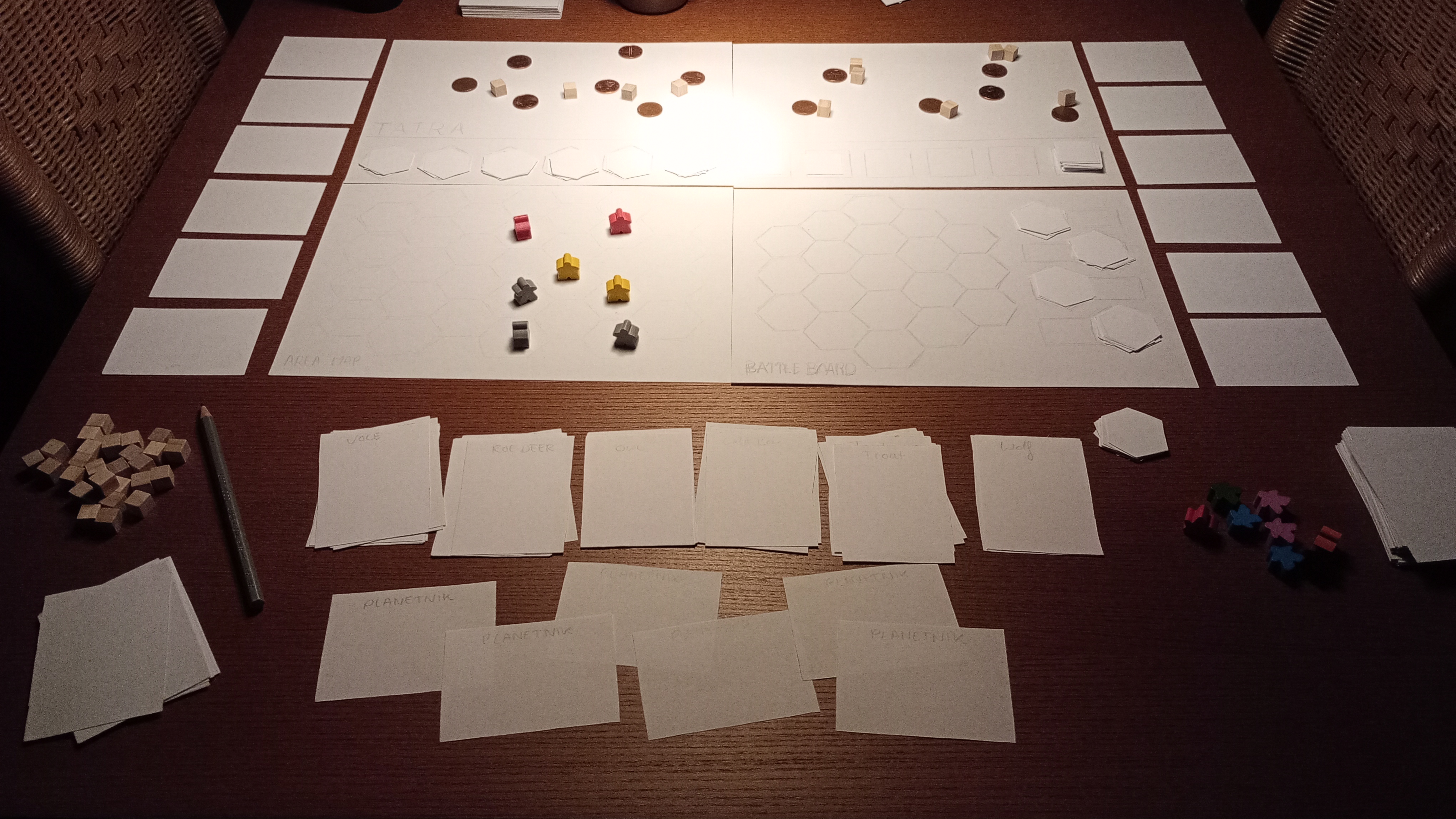 Solo- and semi-cooperative board game taking place in the Tatra mountain range where players recruit animals to build, politically influence and gain control of settlements working with or against the Planetniks.